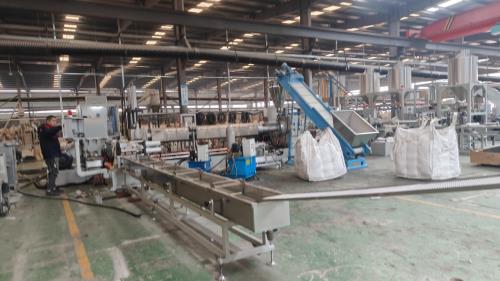 - 設備組成:通常由密煉機、提升機、錐雙喂料機、雙螺桿造粒機低煙無鹵料造粒機__電纜料造粒機_PVC 電纜料造粒機、單螺桿造粒機、風冷模面熱切機頭、旋風分離器、風冷振動篩、成品料倉等組成 。